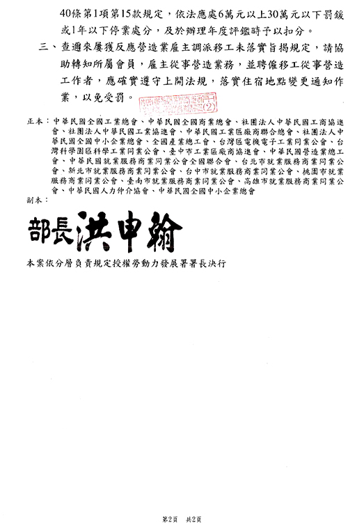 「轉知」有關雇主所聘僱移工如有變更住宿地點情事,依法應於變更後7日內,通知當地主管機關。