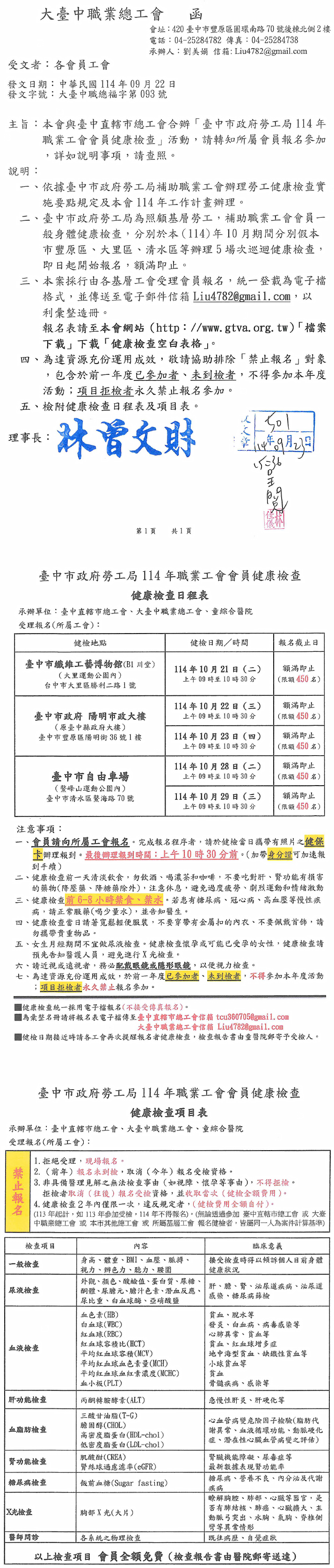 「臺中市政府勞工局114年職業工會會員健康檢查」活動