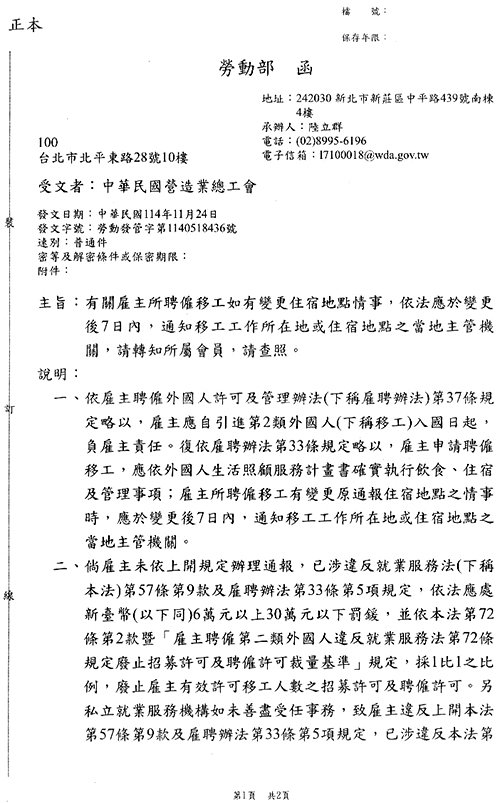 「轉知」有關雇主所聘僱移工如有變更住宿地點情事,依法應於變更後7日內,通知當地主管機關。