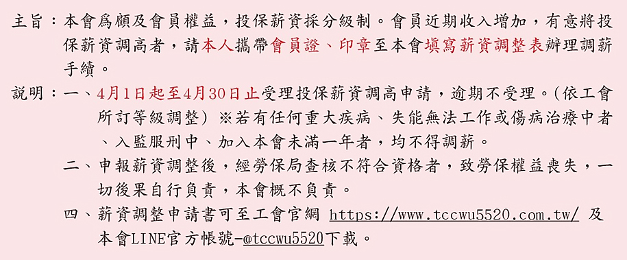 投保薪資採分級制,有意將投保薪資調高者,請本人攜帶會員證、印章至本會填寫薪資調整表辦理調薪手續。
