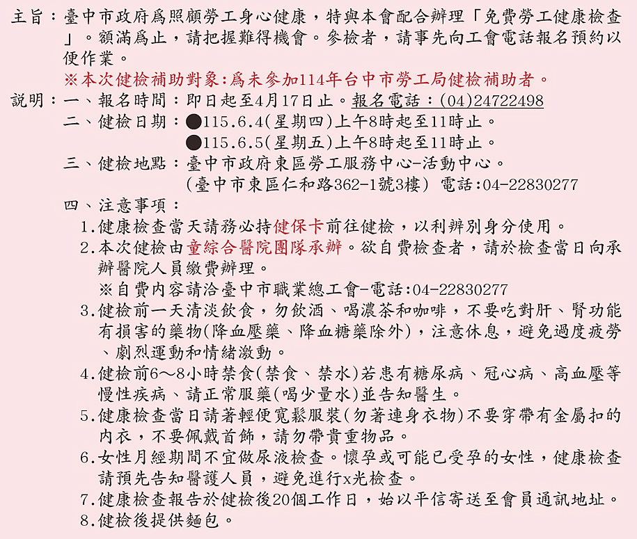 「免費勞工健康檢查」報名即日起至4月17日,額滿為止。